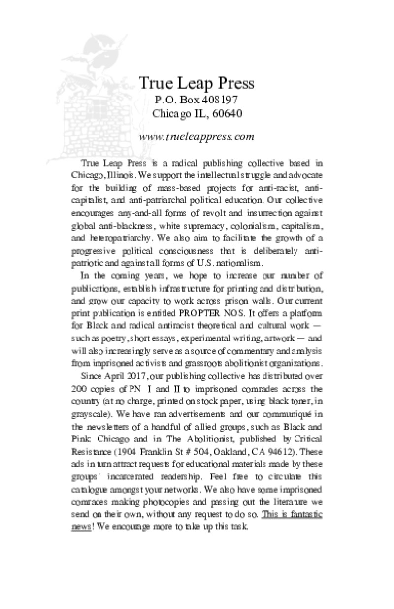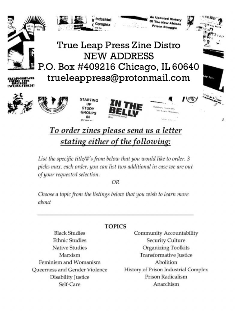 Zines from True Leap Press available for download or order. Incarcerated people can make requests by writing to: South Chicago ABC / PO BOX 721 / Homewood, IL 60430.