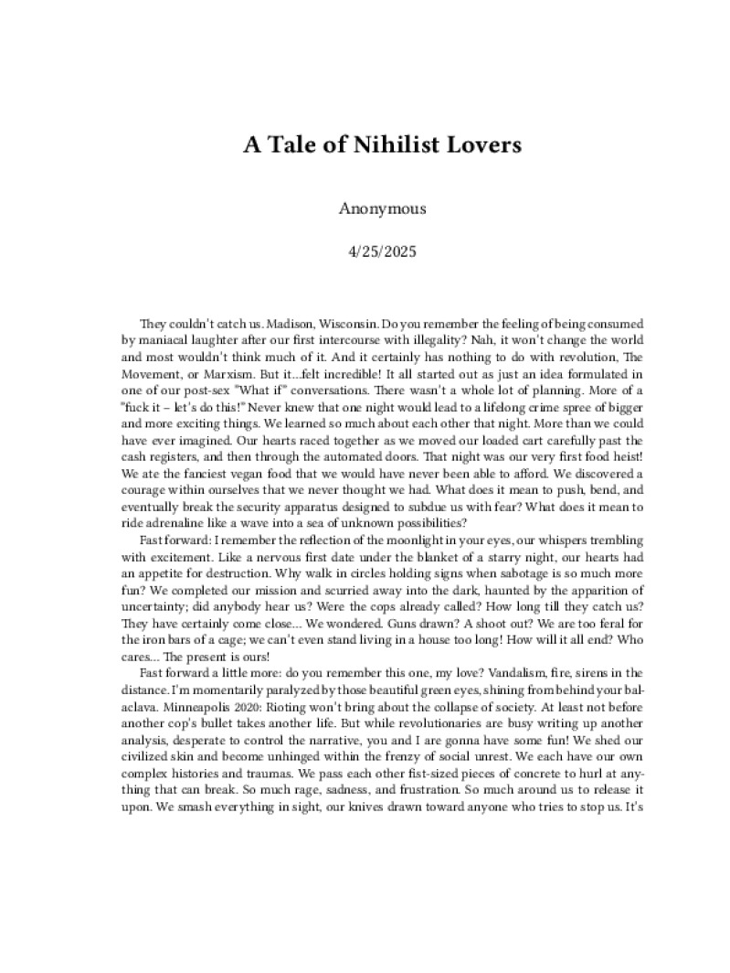 Zine A Tale of Nihilist Lovers Author: AnonymousPublished: 4/25/2025Language: enCatalog: The Anarchist Library4 pages. Read online: html • pdf •imposed pdf • a4 pdf • epub • muse • tex Share: We mail all zines to incarcerated people for free.