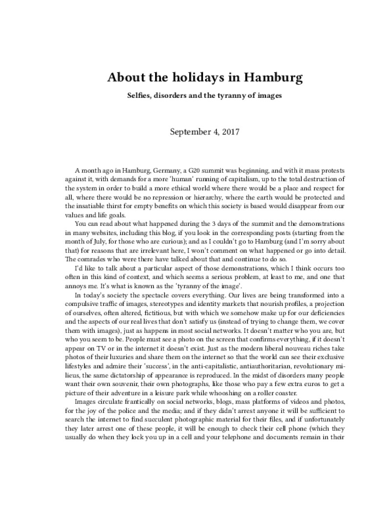 Zine About the holidays in Hamburg Published: September 4, 2017Language: enCatalog: The Anarchist Library6 pages. Read online: html • pdf •imposed pdf • a4 pdf • epub • muse • tex Share: We mail all zines to incarcerated people for free.