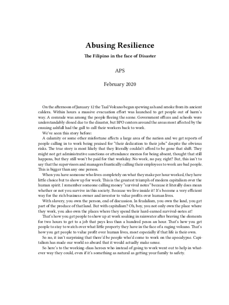 Zine Abusing Resilience Author: APSPublished: February 2020Language: enCatalog: The Anarchist Library2 pages. Read online: html • pdf •imposed pdf • a4 pdf • epub • muse • tex Share: We mail all zines to incarcerated people for free.