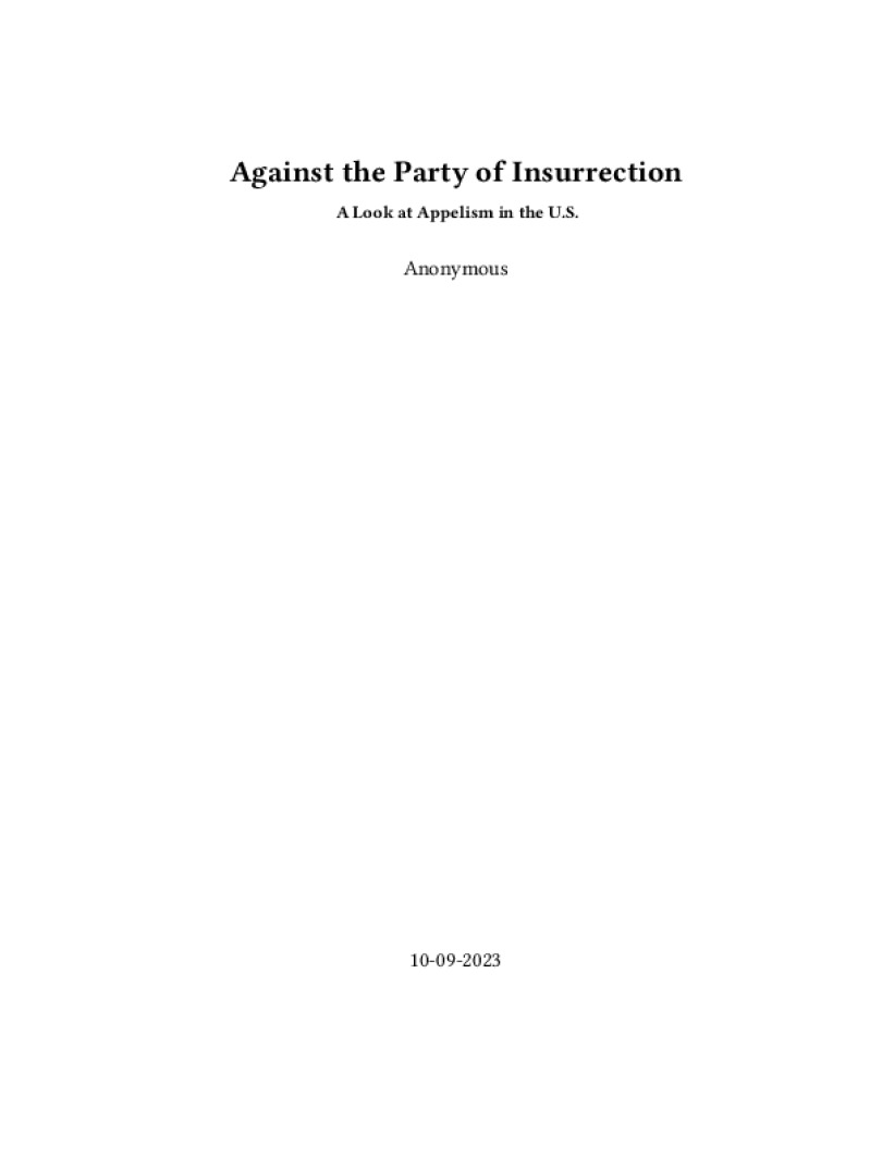 Zine Against the Party of Insurrection Author: AnonymousPublished: 10-09-2023Language: enCatalog: The Anarchist Library17 pages. Read online: html • pdf •imposed pdf • a4 pdf • epub • muse • tex Share: We mail all zines to incarcerated people for free.