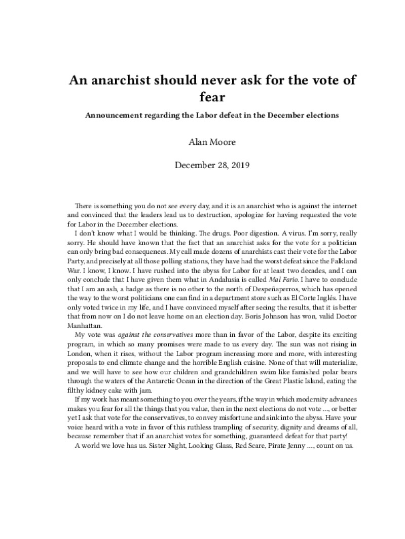 Zine An anarchist should never ask for the vote of fear Author: Alan MoorePublished: December 28, 2019Language: enCatalog: The Anarchist Library2 pages. Read online: html • pdf •imposed pdf • a4 pdf • epub • muse • tex Share: We mail all zines to incarcerated people for free.