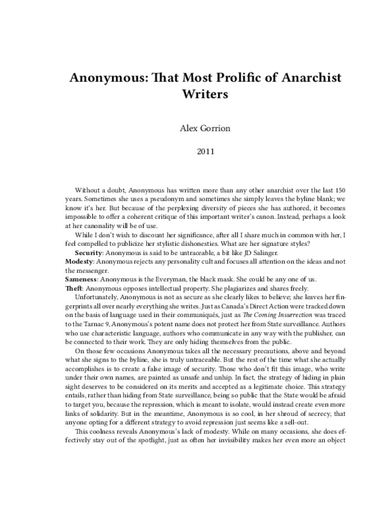 Zine Anonymous: That Most Prolific of Anarchist Writers Author: Alex GorrionPublished: 2011Language: enCatalog: The Anarchist Library3 pages. Read online: html • pdf •imposed pdf • a4 pdf • epub • muse • tex Share: We mail all zines to incarcerated people for free.