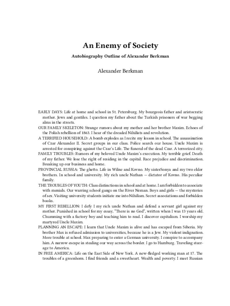 Zine An Enemy of Society Author: Alexander BerkmanLanguage: enCatalog: The Anarchist Library5 pages. Read online: html • pdf •imposed pdf • a4 pdf • epub • muse • tex Share: We mail all zines to incarcerated people for free.