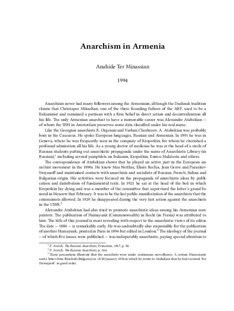 Zine Anarchism in Armenia Author: Anahide Ter MinassianPublished: 1994Language: enCatalog: The Anarchist Library3 pages. Read online: html • pdf •imposed pdf • a4 pdf • epub • muse • tex Share: We mail all zines to incarcerated people for free.