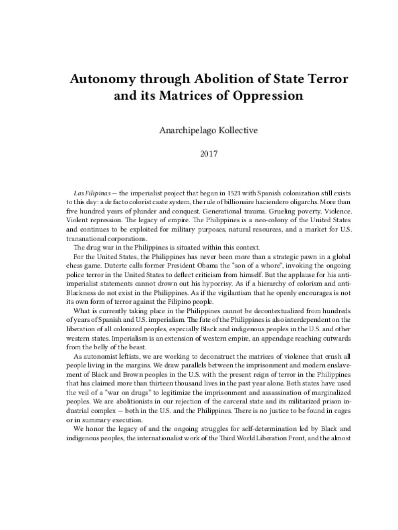 Zine Autonomy through Abolition of State Terror and its Matrices of Oppression Author: Anarchipelago KollectivePublished: 2017Language: enCatalog: The Anarchist Library3 pages. Read online: html • pdf •imposed pdf • a4 pdf • epub • muse • tex Share: We mail all zines to incarcerated people for free.