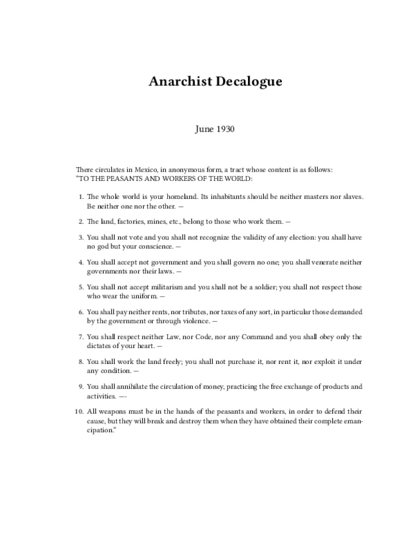 Zine Anarchist Decalogue Published: June 1930Language: enCatalog: The Anarchist Library2 pages. Read online: html • pdf •imposed pdf • a4 pdf • epub • muse • tex Share: We mail all zines to incarcerated people for free.