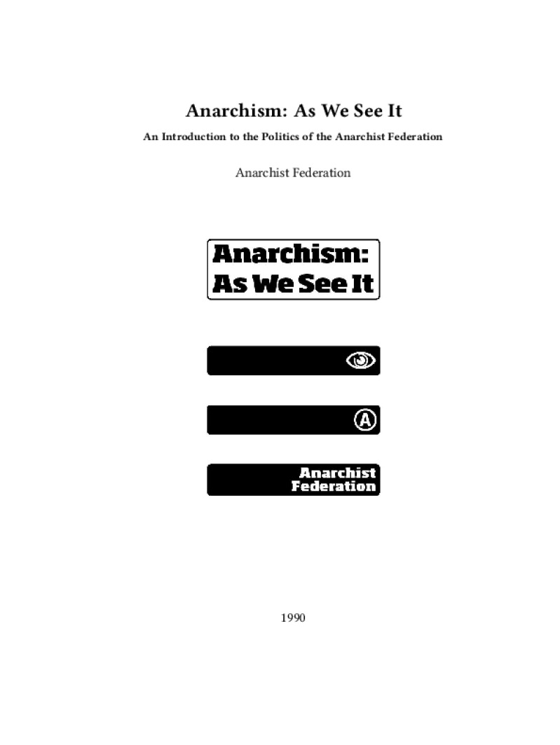 Zine Anarchism: As We See It Author: Anarchist FederationPublished: 1990Language: enCatalog: The Anarchist Library14 pages. Read online: html • pdf •imposed pdf • a4 pdf • epub • muse • tex Share: We mail all zines to incarcerated people for free.