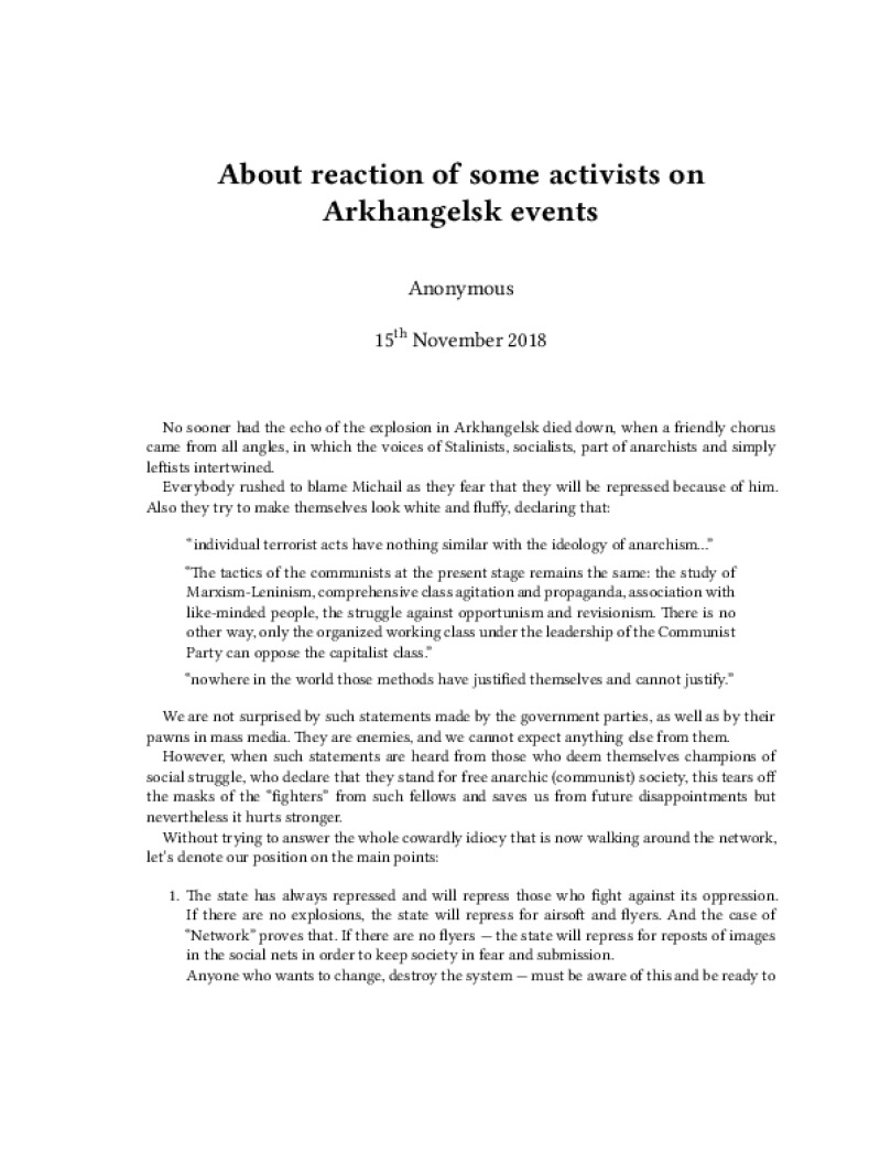 Zine About reaction of some activists on Arkhangelsk events Author: AnonymousPublished: 15th November 2018Language: enCatalog: The Anarchist Library3 pages. Read online: html • pdf •imposed pdf • a4 pdf • epub • muse • tex Share: We mail all zines to incarcerated people for free.