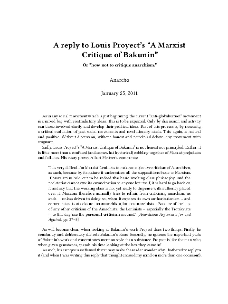 Zine A reply to Louis Proyect’s “A Marxist Critique of Bakunin” Author: AnarchoPublished: January 25, 2011Language: enCatalog: The Anarchist Library39 pages. Read online: html • pdf •imposed pdf • a4 pdf • epub • muse • tex Share: We mail all zines to incarcerated people for free.