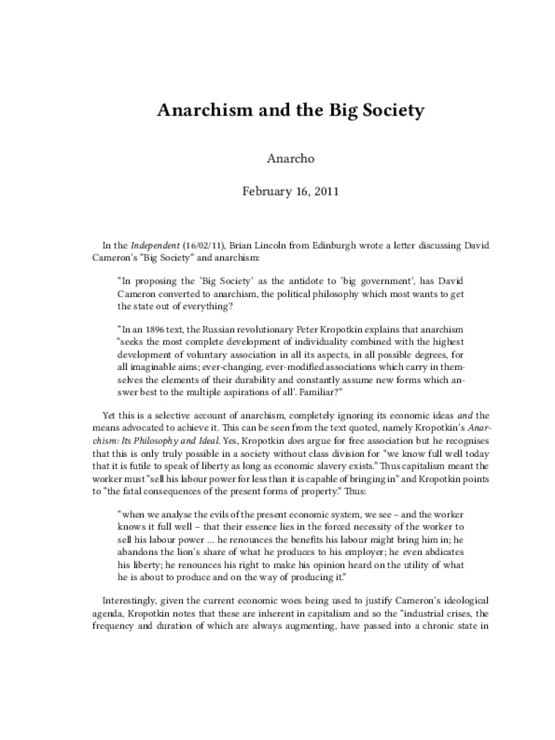 Zine Anarchism and the Big Society Author: AnarchoPublished: February 16, 2011Language: enCatalog: The Anarchist Library4 pages. Read online: html • pdf •imposed pdf • a4 pdf • epub • muse • tex Share: We mail all zines to incarcerated people for free.