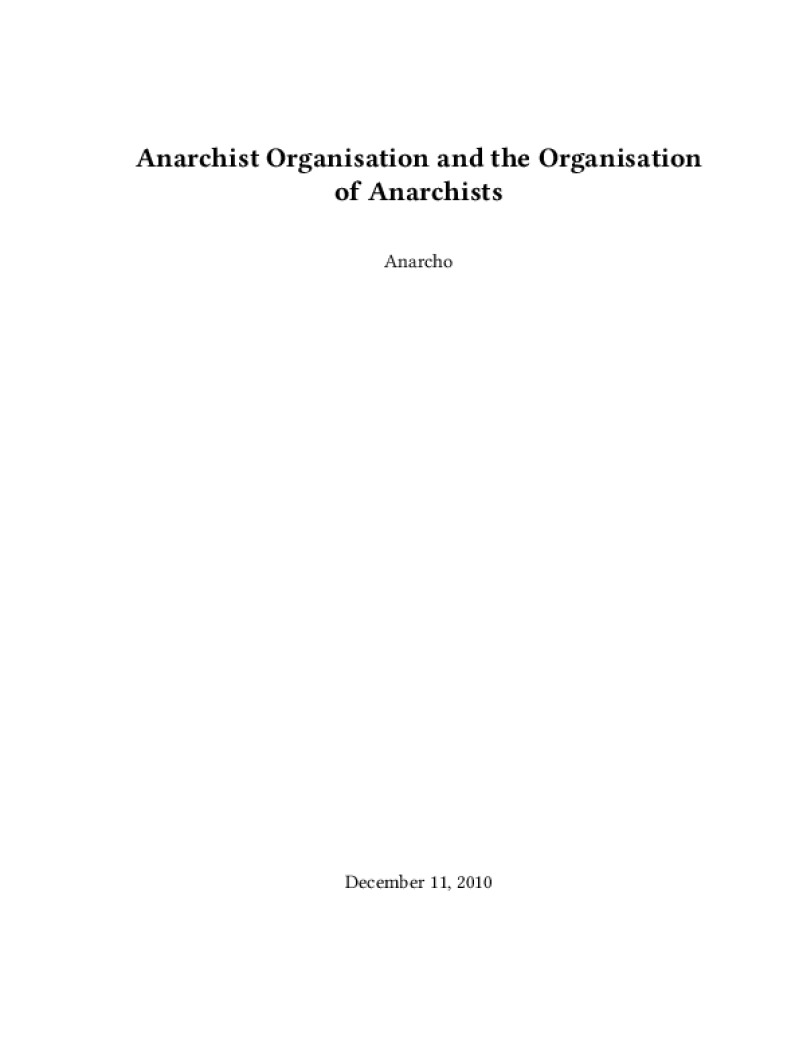 Zine Anarchist Organisation and the Organisation of Anarchists Author: AnarchoPublished: December 11, 2010Language: enCatalog: The Anarchist Library8 pages. Read online: html • pdf •imposed pdf • a4 pdf • epub • muse • tex Share: We mail all zines to incarcerated people for free.