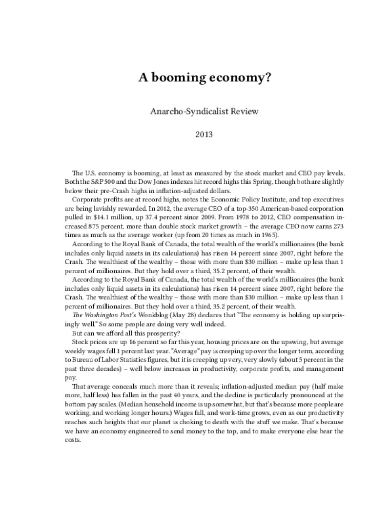 Zine A booming economy? Author: Anarcho-Syndicalist ReviewPublished: 2013Language: enCatalog: The Anarchist Library4 pages. Read online: html • pdf •imposed pdf • a4 pdf • epub • muse • tex Share: We mail all zines to incarcerated people for free.