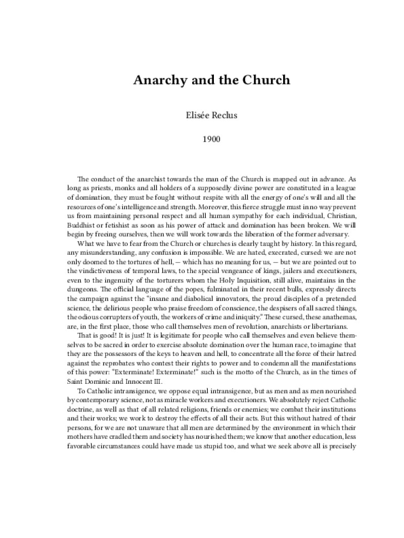 Zine Anarchy and the Church Author: Elisée ReclusPublished: 1900Language: enCatalog: The Anarchist Library8 pages. Read online: html • pdf •imposed pdf • a4 pdf • epub • muse • tex Share: We mail all zines to incarcerated people for free.