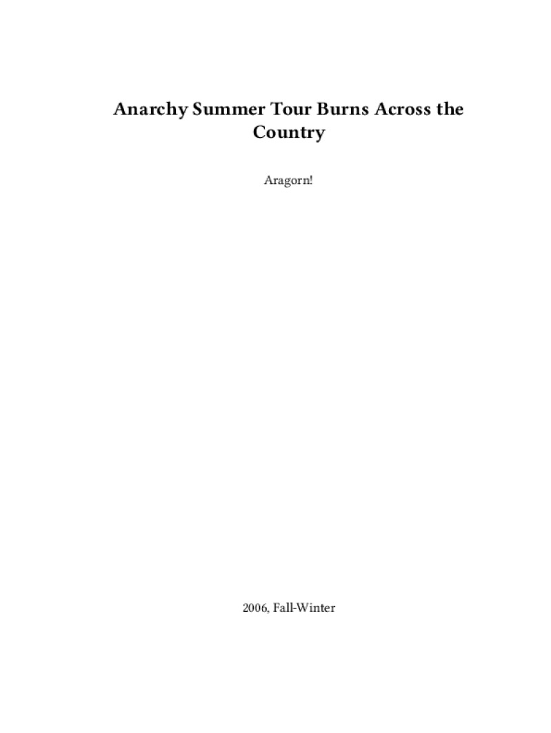 Zine Anarchy Summer Tour Burns Across the Country Author: Aragorn!Published: 2006, Fall-WinterLanguage: enCatalog: The Anarchist Library9 pages. Read online: html • pdf •imposed pdf • a4 pdf • epub • muse • tex Share: We mail all zines to incarcerated people for free.