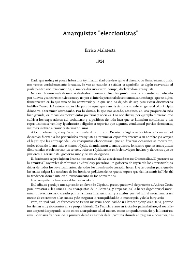 Zine Anarquistas "eleccionistas" Author: Errico MalatestaPublished: 1924Language: esCatalog: The Anarchist Library4 pages. Read online: html • pdf •imposed pdf • a4 pdf • epub • muse • tex Share: We mail all zines to incarcerated people for free.