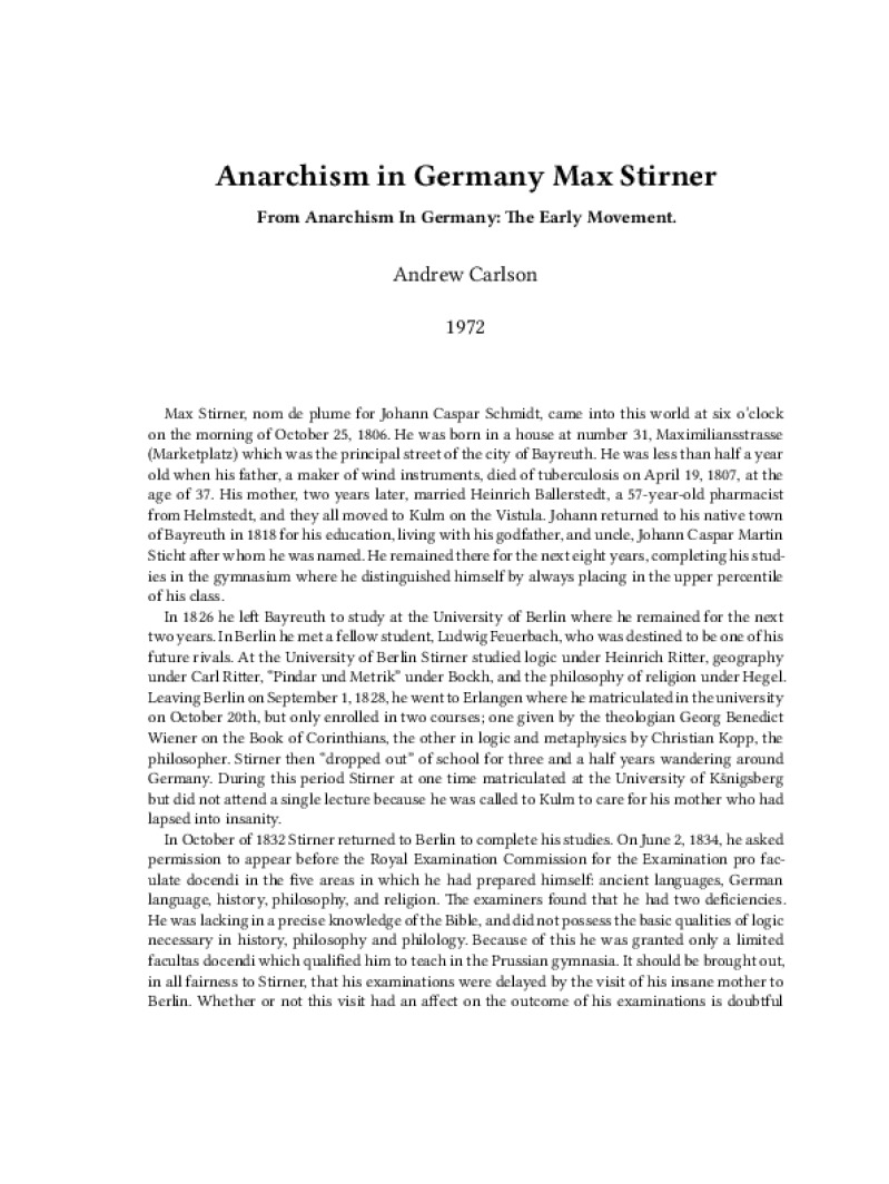 Zine Anarchism in Germany Max Stirner Author: Andrew CarlsonPublished: 1972Language: enCatalog: The Anarchist Library11 pages. Read online: html • pdf •imposed pdf • a4 pdf • epub • muse • tex Share: We mail all zines to incarcerated people for free.