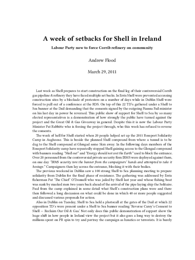 Zine A week of setbacks for Shell in Ireland Author: Andrew FloodPublished: March 29, 2011Language: enCatalog: The Anarchist Library4 pages. Read online: html • pdf •imposed pdf • a4 pdf • epub • muse • tex Share: We mail all zines to incarcerated people for free.