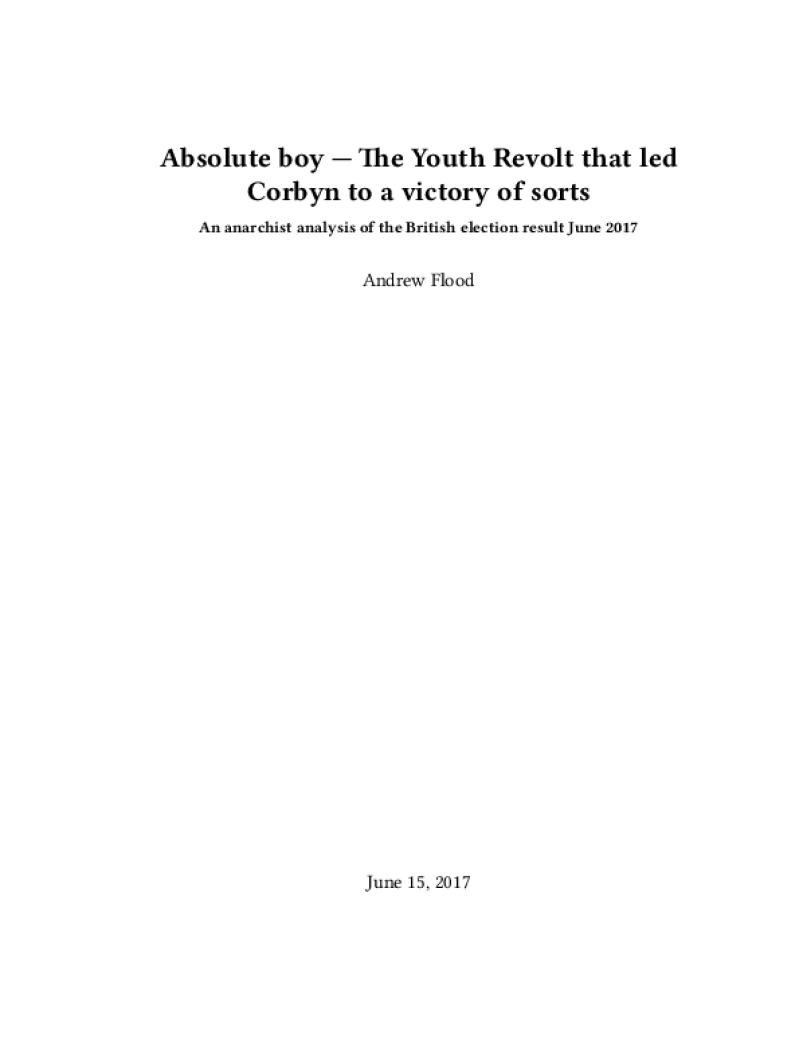 Zine Absolute boy — The Youth Revolt that led Corbyn to a victory of sorts Author: Andrew FloodPublished: June 15, 2017Language: enCatalog: The Anarchist Library15 pages. Read online: html • pdf •imposed pdf • a4 pdf • epub • muse • tex Share: We mail all zines to incarcerated people for free.
