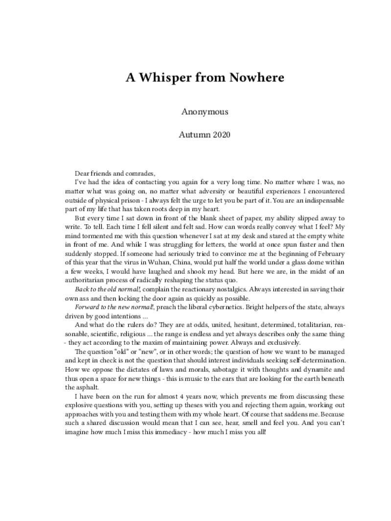 Zine A Whisper from Nowhere Author: AnonymousPublished: Autumn 2020Language: enCatalog: The Anarchist Library3 pages. Read online: html • pdf •imposed pdf • a4 pdf • epub • muse • tex Share: We mail all zines to incarcerated people for free.
