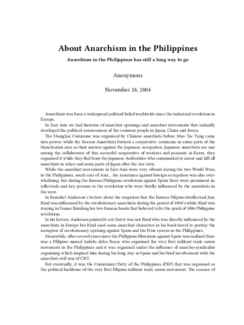 Zine About Anarchism in the Philippines Author: AnonymousPublished: November 24, 2004Language: enCatalog: The Anarchist Library3 pages. Read online: html • pdf •imposed pdf • a4 pdf • epub • muse • tex Share: We mail all zines to incarcerated people for free.