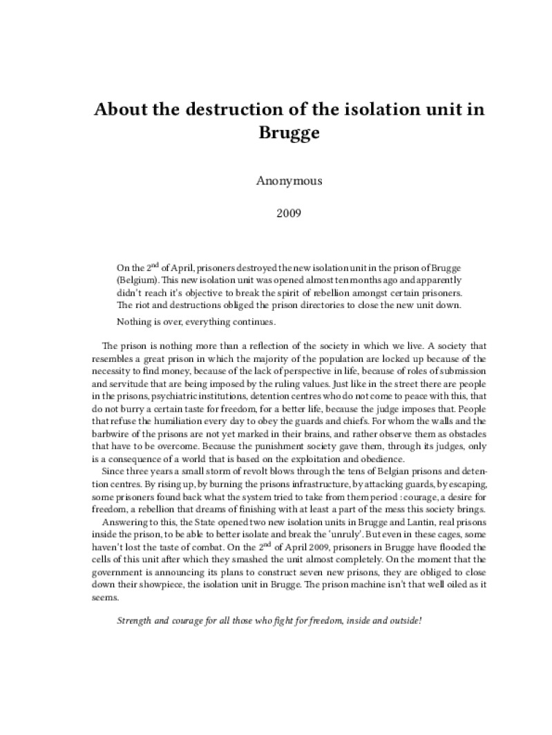 Zine About the destruction of the isolation unit in Brugge Author: AnonymousPublished: 2009Language: enCatalog: The Anarchist Library3 pages. Read online: html • pdf •imposed pdf • a4 pdf • epub • muse • tex Share: We mail all zines to incarcerated people for free.