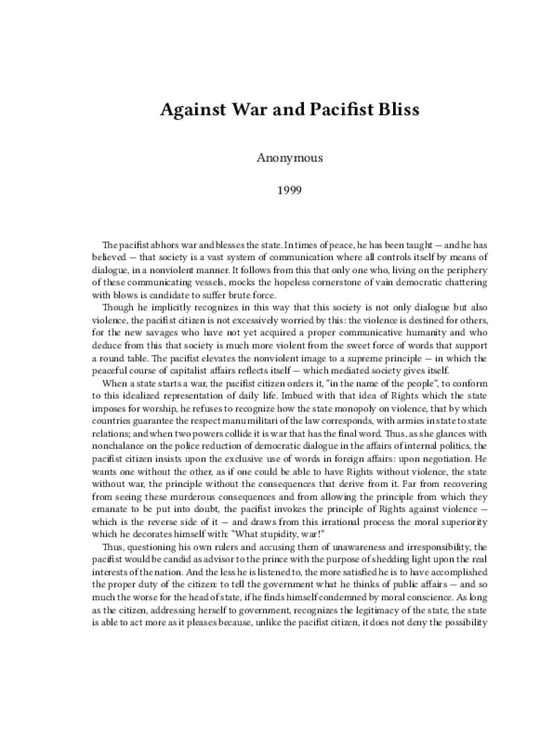 Zine Against War and Pacifist Bliss Author: AnonymousPublished: 1999Language: enCatalog: The Anarchist Library3 pages. Read online: html • pdf •imposed pdf • a4 pdf • epub • muse • tex Share: We mail all zines to incarcerated people for free.