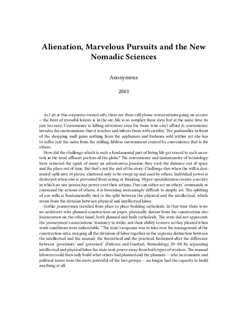 Zine Alienation, Marvelous Pursuits and the New Nomadic Sciences Author: AnonymousPublished: 2001Language: enCatalog: The Anarchist Library6 pages. Read online: html • pdf •imposed pdf • a4 pdf • epub • muse • tex Share: We mail all zines to incarcerated people for free.