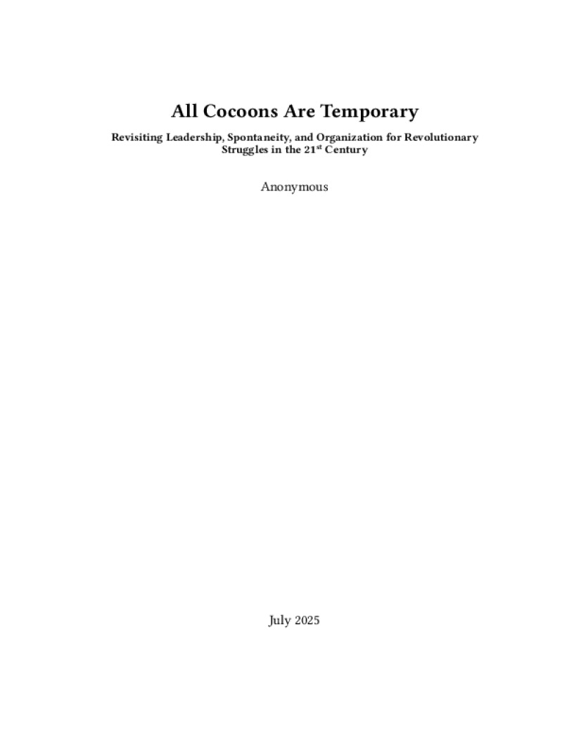 Zine All Cocoons Are Temporary Author: AnonymousPublished: July 2025Language: enCatalog: The Anarchist Library25 pages. Read online: html • pdf •imposed pdf • a4 pdf • epub • muse • tex Share: We mail all zines to incarcerated people for free.