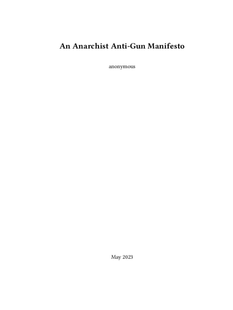 Zine An Anarchist Anti-Gun Manifesto Author: IgnatiusPublished: May 2023Language: enCatalog: The Anarchist Library8 pages. Read online: html • pdf •imposed pdf • a4 pdf • epub • muse • tex Share: We mail all zines to incarcerated people for free.