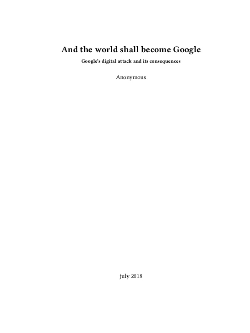Zine And the world shall become Google Author: AnonymousPublished: july 2018Language: enCatalog: The Anarchist Library13 pages. Read online: html • pdf •imposed pdf • a4 pdf • epub • muse • tex Share: We mail all zines to incarcerated people for free.