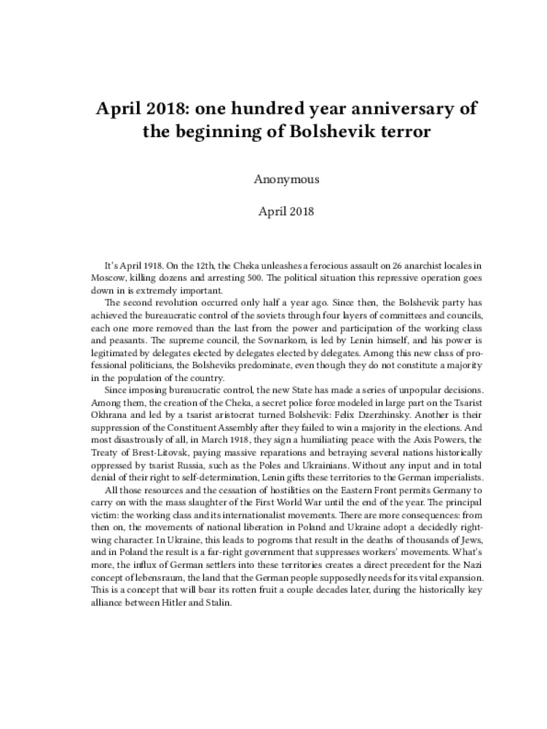 Zine April 2018: one hundred year anniversary of the beginning of Bolshevik terror Author: AnonymousPublished: April 2018Language: enCatalog: The Anarchist Library4 pages. Read online: html • pdf •imposed pdf • a4 pdf • epub • muse • tex Share: We mail all zines to incarcerated people for free.