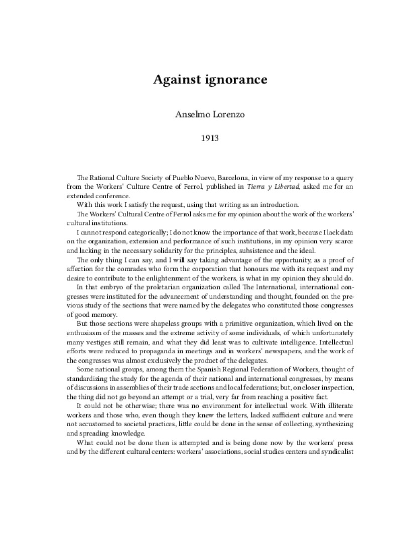 Zine Against ignorance Author: Anselmo LorenzoPublished: 1913Language: enCatalog: The Anarchist Library15 pages. Read online: html • pdf •imposed pdf • a4 pdf • epub • muse • tex Share: We mail all zines to incarcerated people for free.
