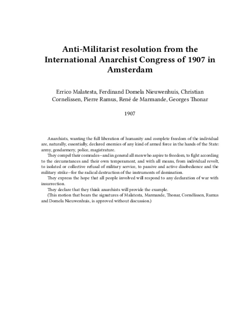 Anti-Militarist resolution from the International Anarchist Congress of 1907 in Amsterdam