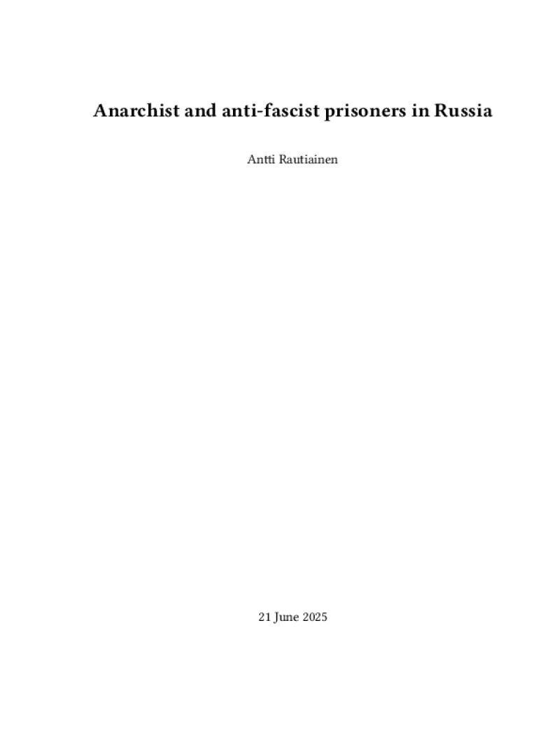 Zine Anarchist and anti-fascist prisoners in Russia Author: Antti RautiainenPublished: 21 June 2025Language: enCatalog: The Anarchist Library6 pages. Read online: html • pdf •imposed pdf • a4 pdf • epub • muse • tex Share: We mail all zines to incarcerated people for free.
