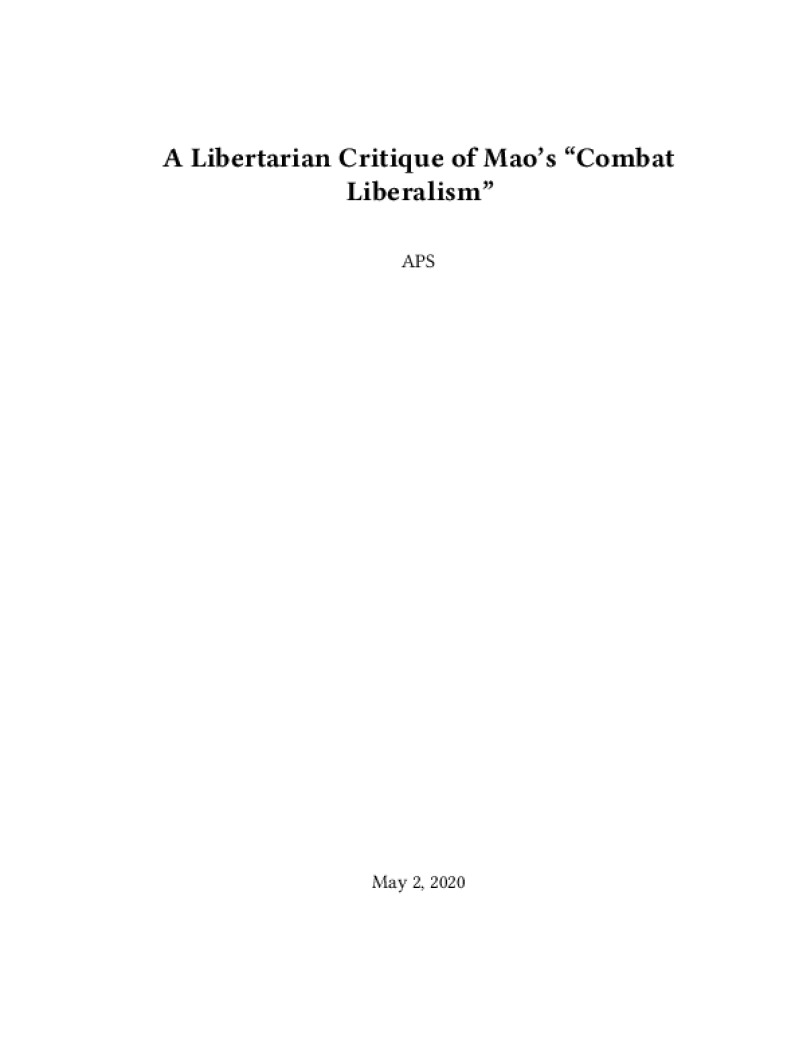 Zine A Libertarian Critique of Mao’s “Combat Liberalism” Author: APSPublished: May 2, 2020Language: enCatalog: The Anarchist Library10 pages. Read online: html • pdf •imposed pdf • a4 pdf • epub • muse • tex Share: We mail all zines to incarcerated people for free.