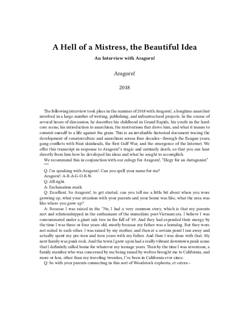 Zine A Hell of a Mistress, the Beautiful Idea Author: Aragorn!Published: 2018Language: enCatalog: The Anarchist Library31 pages. Read online: html • pdf •imposed pdf • a4 pdf • epub • muse • tex Share: We mail all zines to incarcerated people for free.