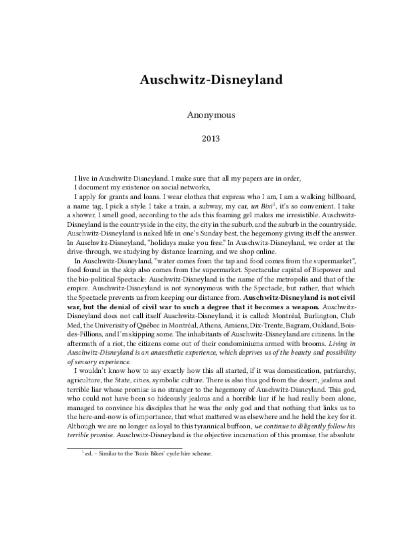 Zine Auschwitz-Disneyland Author: AnonymousPublished: 2013Language: enCatalog: The Anarchist Library4 pages. Read online: html • pdf •imposed pdf • a4 pdf • epub • muse • tex Share: We mail all zines to incarcerated people for free.