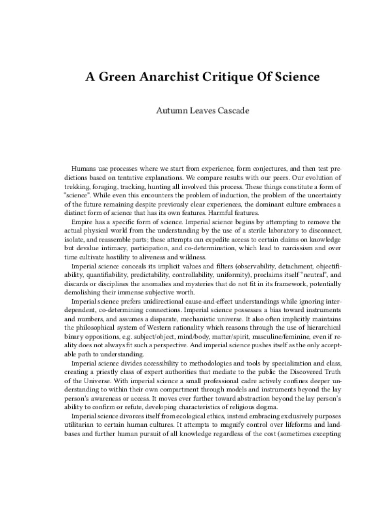 Zine A Green Anarchist Critique Of Science Author: Autumn Leaves CascadeLanguage: enCatalog: The Anarchist Library3 pages. Read online: html • pdf •imposed pdf • a4 pdf • epub • muse • tex Share: We mail all zines to incarcerated people for free.