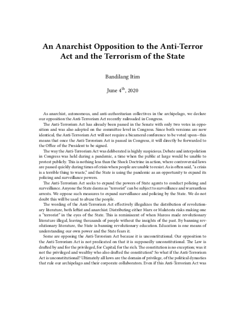 Zine An Anarchist Opposition to the Anti-Terror Act and the Terrorism of the State Author: Bandilang ItimPublished: June 4th, 2020Language: enCatalog: The Anarchist Library4 pages. Read online: html • pdf •imposed pdf • a4 pdf • epub • muse • tex Share: We mail all zines to incarcerated people for free.