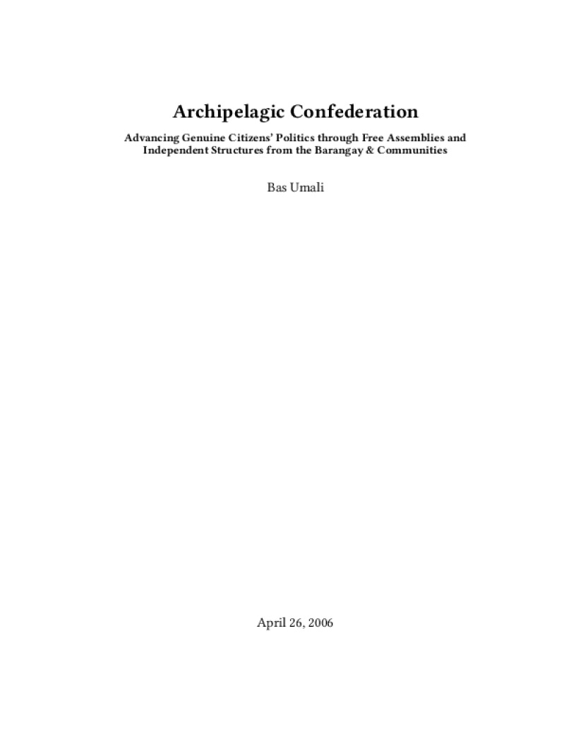 Zine Archipelagic Confederation Author: Bas UmaliPublished: April 26, 2006Language: enCatalog: The Anarchist Library12 pages. Read online: html • pdf •imposed pdf • a4 pdf • epub • muse • tex Share: We mail all zines to incarcerated people for free.