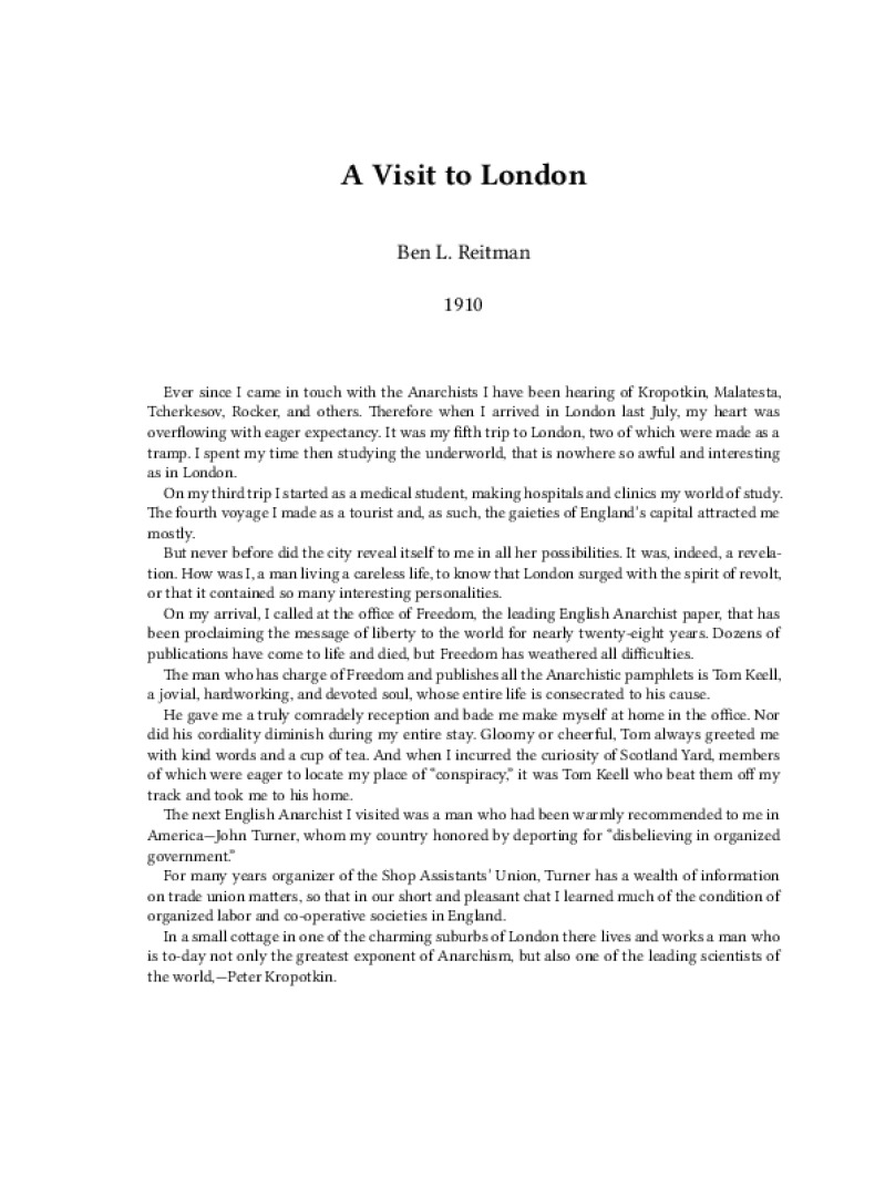Zine A Visit to London Author: Ben L. ReitmanPublished: 1910Language: enCatalog: The Anarchist Library4 pages. Read online: html • pdf •imposed pdf • a4 pdf • epub • muse • tex Share: We mail all zines to incarcerated people for free.