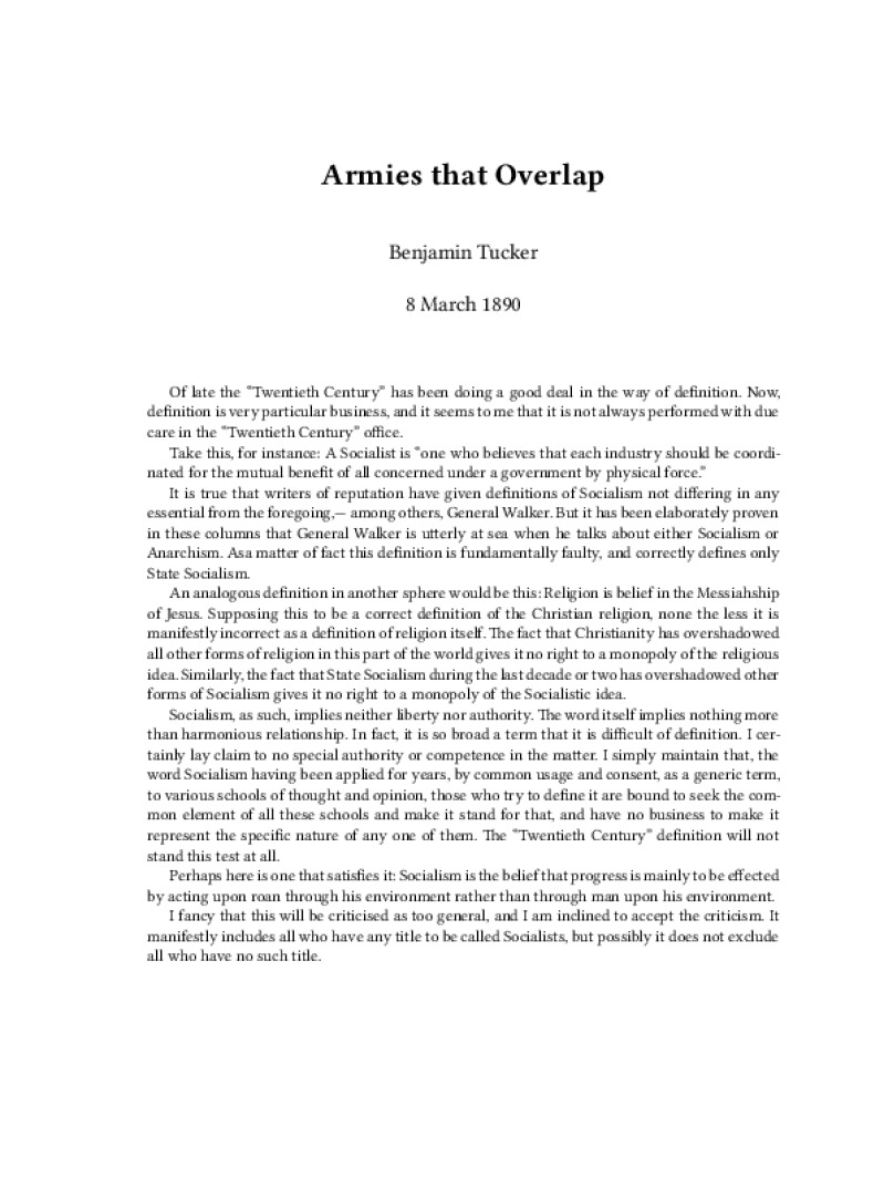 Zine Armies that Overlap Author: Benjamin TuckerPublished: 8 March 1890Language: enCatalog: The Anarchist Library3 pages. Read online: html • pdf •imposed pdf • a4 pdf • epub • muse • tex Share: We mail all zines to incarcerated people for free.