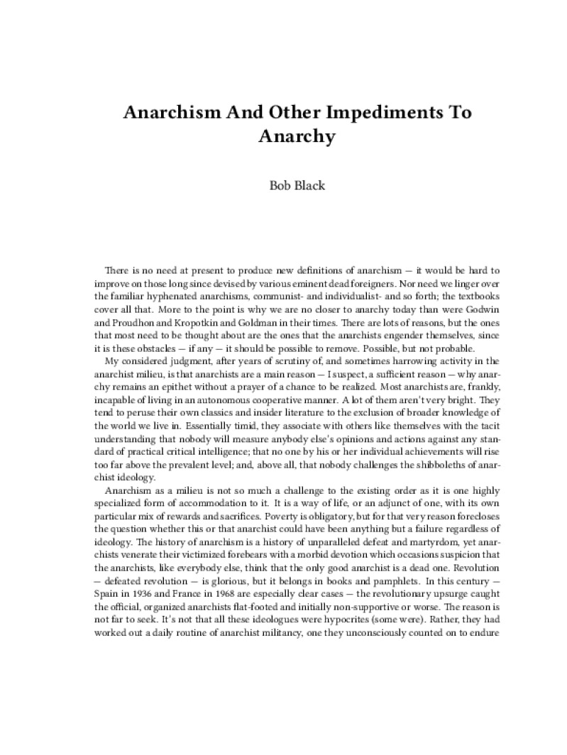 Zine Anarchism And Other Impediments To Anarchy Author: Bob BlackLanguage: enCatalog: The Anarchist Library3 pages. Read online: html • pdf •imposed pdf • a4 pdf • epub • muse • tex Share: We mail all zines to incarcerated people for free.