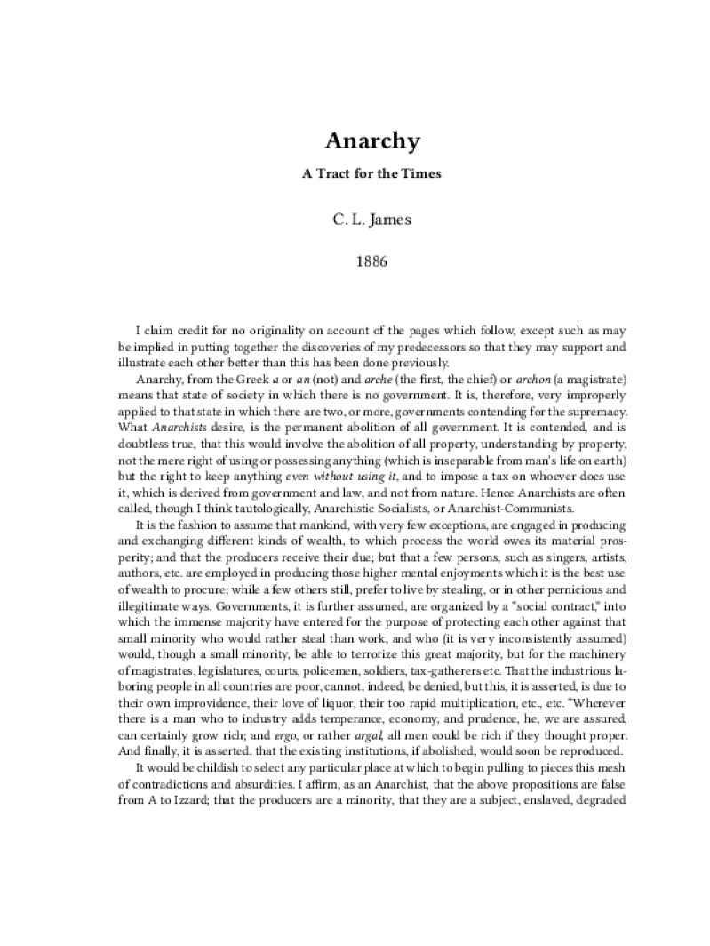 Zine Anarchy Author: C. L. JamesPublished: 1886Language: enCatalog: The Anarchist Library25 pages. Read online: html • pdf •imposed pdf • a4 pdf • epub • muse • tex Share: We mail all zines to incarcerated people for free.