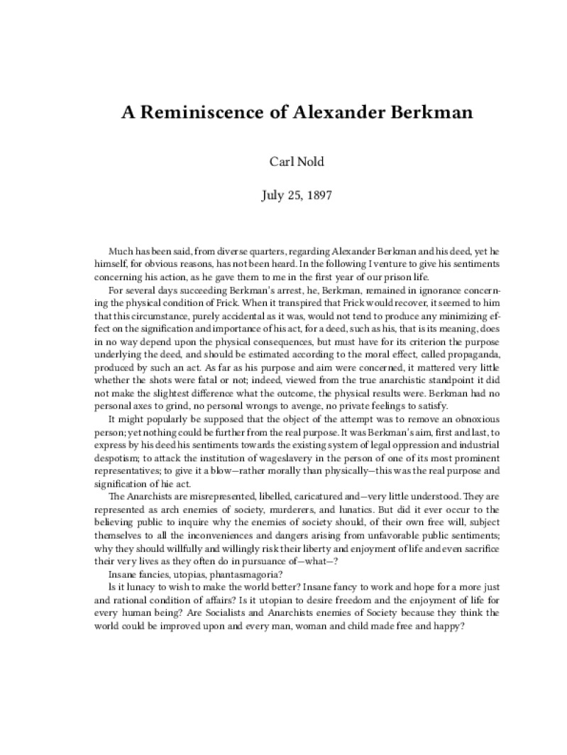 Zine A Reminiscence of Alexander Berkman Author: Carl NoldPublished: July 25, 1897Language: enCatalog: The Anarchist Library4 pages. Read online: html • pdf •imposed pdf • a4 pdf • epub • muse • tex Share: We mail all zines to incarcerated people for free.