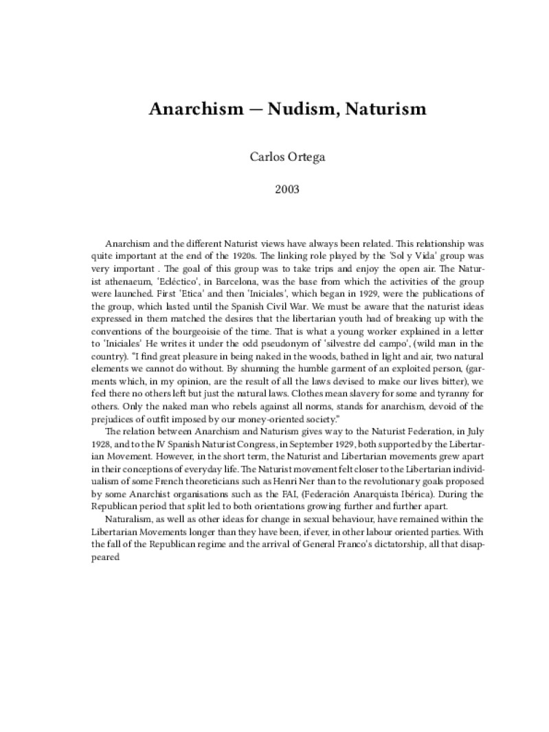 Zine Anarchism — Nudism, Naturism Author: Carlos OrtegaPublished: 2003Language: enCatalog: The Anarchist Library2 pages. Read online: html • pdf •imposed pdf • a4 pdf • epub • muse • tex Share: We mail all zines to incarcerated people for free.