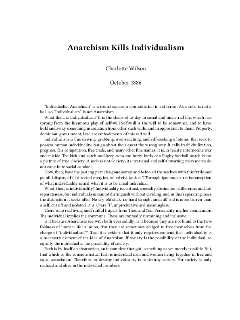 Zine Anarchism Kills Individualism Author: Charlotte WilsonPublished: October 1886Language: enCatalog: The Anarchist Library4 pages. Read online: html • pdf •imposed pdf • a4 pdf • epub • muse • tex Share: We mail all zines to incarcerated people for free.