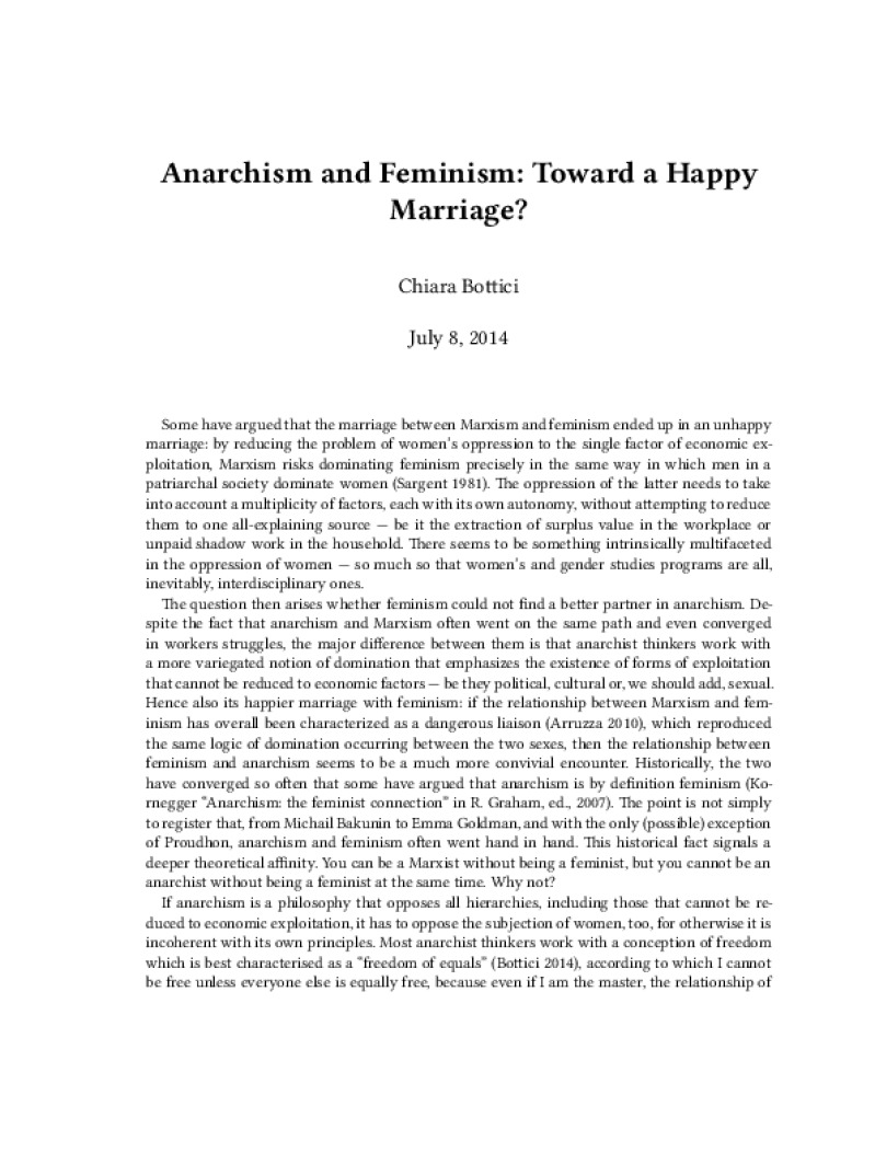 Zine Anarchism and Feminism: Toward a Happy Marriage? Author: Chiara BotticiPublished: July 8, 2014Language: enCatalog: The Anarchist Library6 pages. Read online: html • pdf •imposed pdf • a4 pdf • epub • muse • tex Share: We mail all zines to incarcerated people for free.
