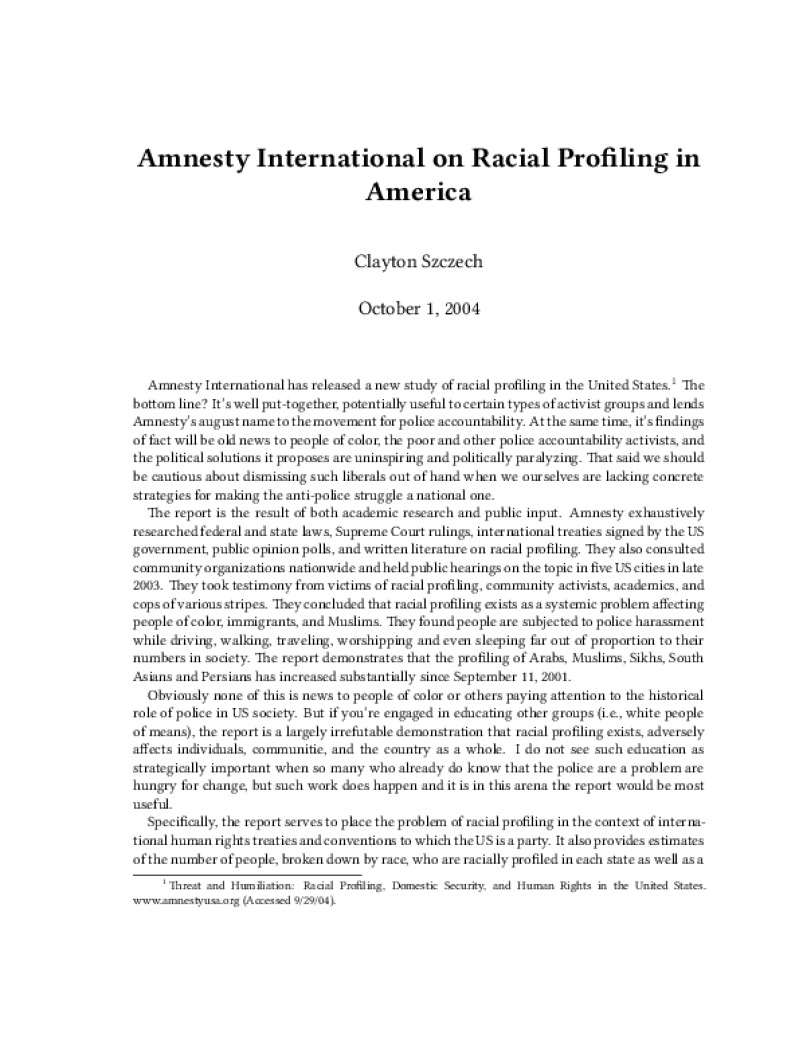 Zine Amnesty International on Racial Profiling in America Author: Clayton SzczechPublished: October 1, 2004Language: enCatalog: The Anarchist Library3 pages. Read online: html • pdf •imposed pdf • a4 pdf • epub • muse • tex Share: We mail all zines to incarcerated people for free.